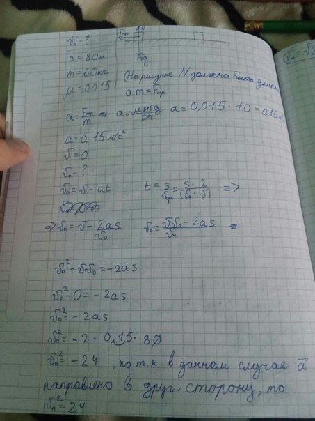 6. Конькобежец проезжает по гладкой горизонтальной поверхности льда по инерции расстояние, равное 80 м. Какова начальная скорость конькобежца, если его масса равна 60 кг, а коэффициент трения равен 0,015?
