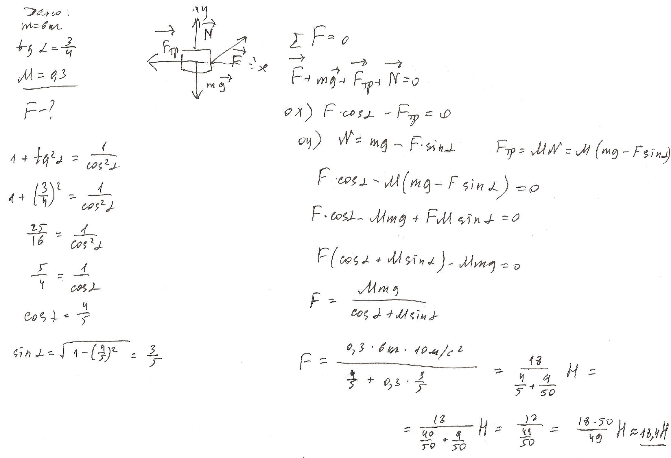Человек тянет за собой с постоянной скоростью санки массой 6 кг с помощью веревки ,составляющей с горизонтом угол, тангенс которого равен 0.75 коэффициент трения между санками и горизонтальной поверхностью 0.3. Определите силу натяжения веревки.