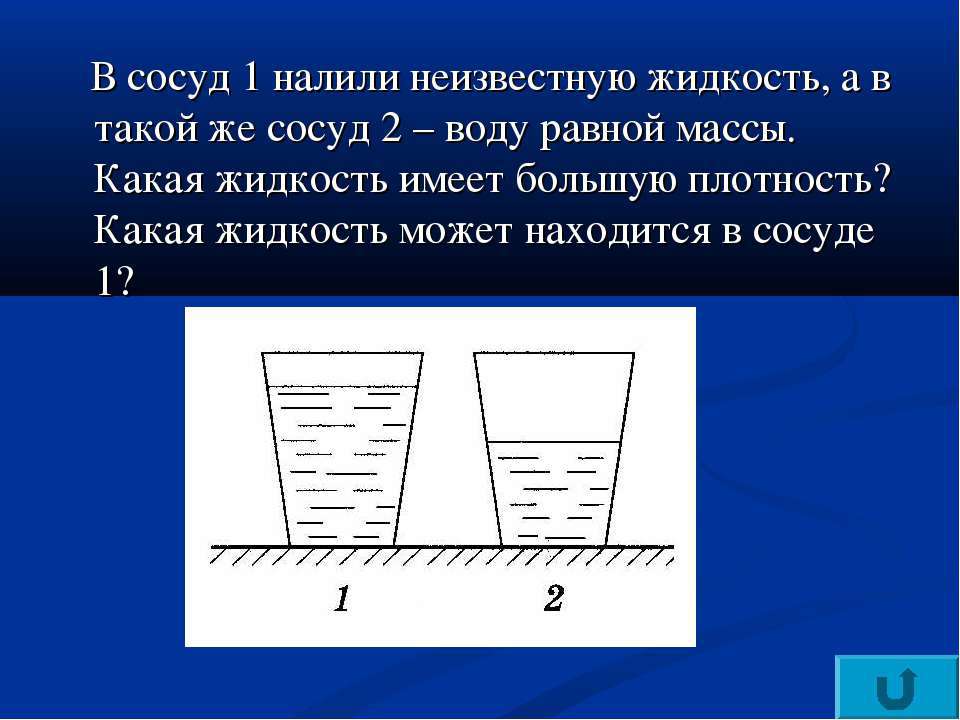 налили неизвестную жидкость, а в такой же сосуд 2 воду равной массы. Какая жидкость имеет большую плотность? Какая это может быть жидкость? ПАМАГИТЕ ПЛИЗЗ,,,