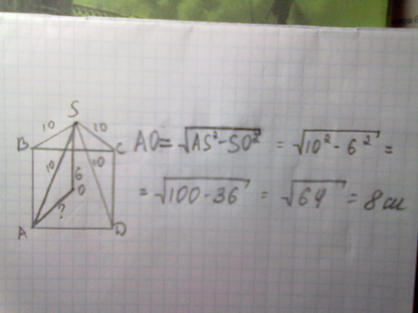 Відстань від точки S до кожної з вершин квадрата ABCD дорівнює 10см. Знайти діагональ квадрата ABCD, якщо відстань від S до його площини дорівнює 6 см.