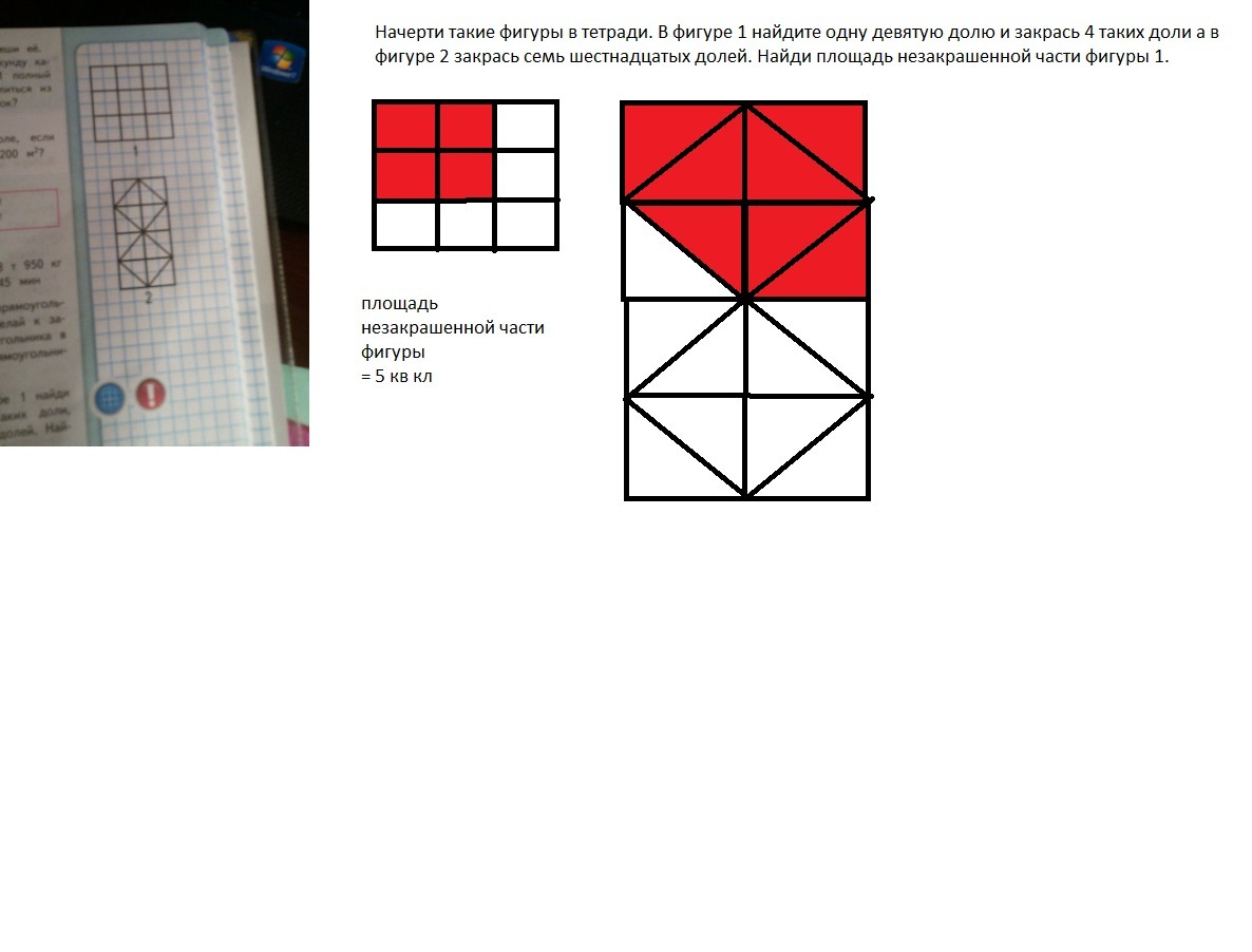 Начерти такие фигуры в тетради.В фигуре 1 найди одну девятую долю и закрась четыре таких доли,а в фигуре 2 закрась семь шестнадцатых долей.Найди площадь незакрашенной части фигуры 1. Кто зделает дам 100 баллов пришлите фото!!!
