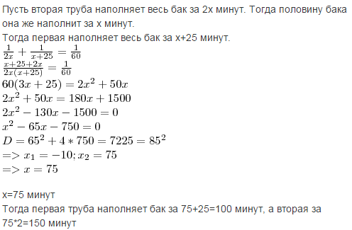 Первая труба наполняет бак на 25 минут дольше, чем вторая труба наполняет