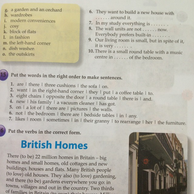 There are three cushions on the sofa. They want to put a coffee table in the right-hand corner. There is a round table and eight chairs opposite the door. His family has got a new vacuum cleaner.There are a lot of pictures on the wall. There are not any bedside tables in the bedroom. Their granny likes sometimes to rearrange the furniture in her room.