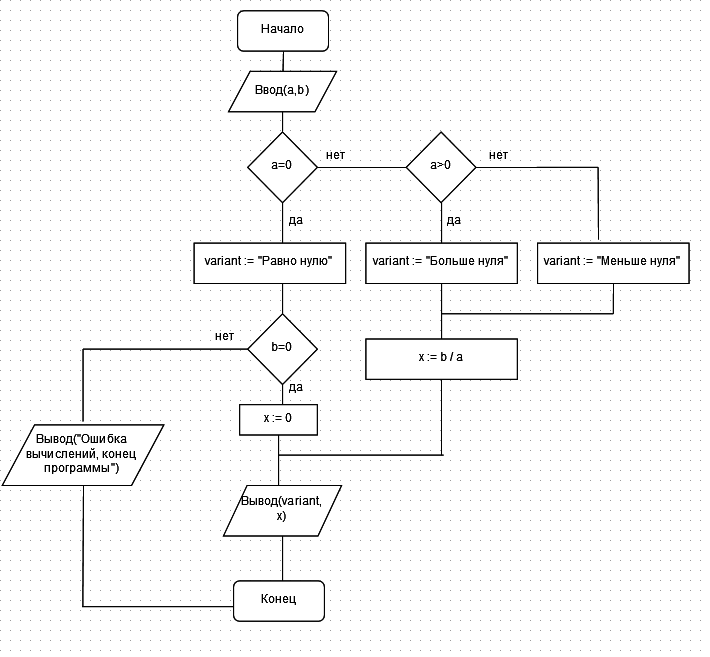 Составить ветвлённый алгоритм a × x = b, где a и b - заданные числа;