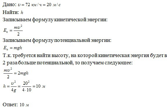 на какой высоте кинетическая энергия будет в 2 раза больше потенциальной, если тело брошено вертикально вверх со скоростью 72 км/ч
