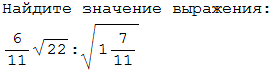 6/11sqrt{22} / sqrt{1 7/11}=sqrt{72} / sqrt{18/11}= sqrt{72/(18/11)} = sqrt{72*11/18}= sqrt{44} = 2 sqrt{11}