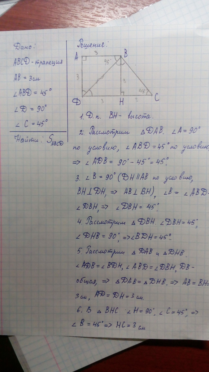 в прямоугольном трапеции меньшее основание равно 3 см и составляет с меньшей диагональю угол45' .острый угол трапеции равен 45'.Найти площадь трапеции