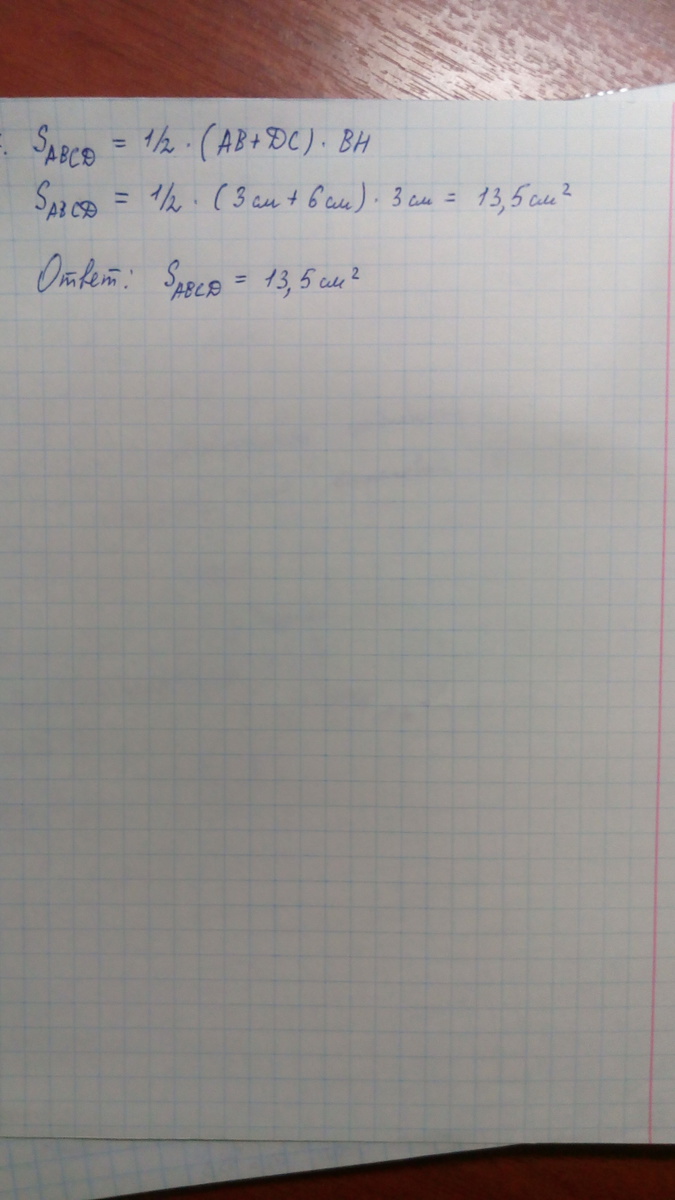√36=6 ⇒площадь =(6+3)÷2×3=13,5