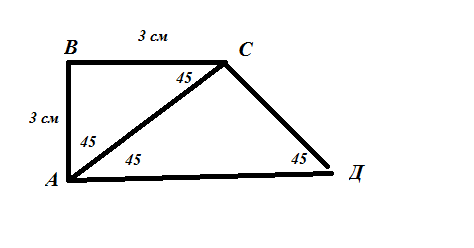 доказываем что АВС равнобедренный: ∠С=45, ∠В=90⇒∠А=45, значит АВ=3см, она же высота. треугольник АДС тоже равнобедренный АС=СД,по теореме Пифагора находим АС=√АВ²+ВС²=√3²+3²=√18, теперь рассматриваем АСД тоже можно по теореме Пифагора найти АД=√АС²+СД²=√(√18²+√18²)=