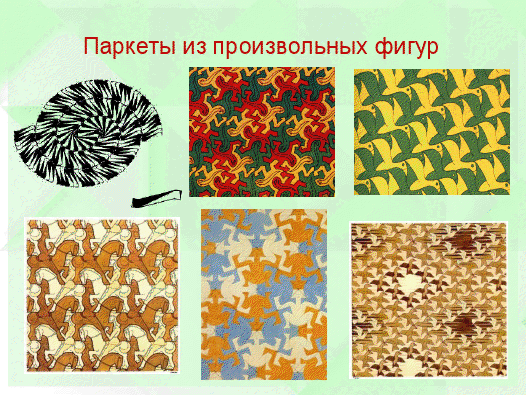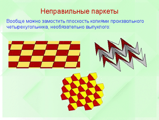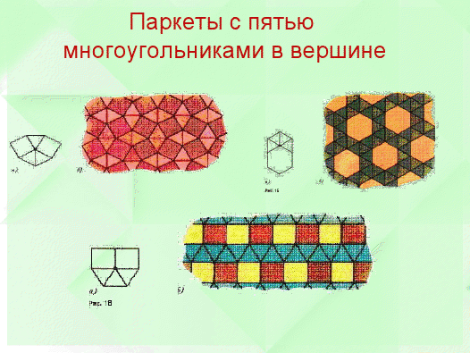 Вставьте пожалуйста картинки:1.паркеты с 5 многоугольниками в вершине 2.паркет из произвольных фигур 3.неправильные паркеты. ПОЖАЛУЙСТА!