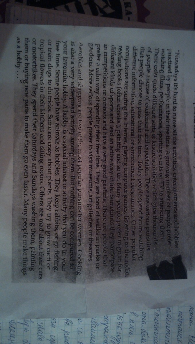 В настоящее время трудно назвать все мероприятия, развлечения и хобби Занимался людьми в их свободное время. Растущее число людей предпочитают смотреть фильмы, спектакли, спортивные события по телевизору, чтобы посещать их достаточно существуют differert виды отдыха стей, которые дают тысячам людей чувство волнения и ожидания. Есть различные занятия, что люди выбирают, чтобы пройти их свободные люди тратят часы, наблюдая различные информационные, образовательные или окружающей среды программ. Другие популярные занятия серфинга в Интернете, играть в компьютерные игры, слушать радио читальных книг (часто КНИГ), живописи и так далее. Многие люди предпочитают идти в разных видах спорта и вести активный образ жизни. Иногда они участвуют в соревнованиях или конкурсах людей, которые и есть очень хороший времяпрепровождение. Есть предпочитают спокойный способ speriding свое свободное время. Они любят прогулок в парках или садах. Более серьезные люди предпочитают посещать музеи, художественные галереи или театры. Аэробика и магазины находятся два сусла популярных занятий Лор женщин. Кулинария также очень широко распространенная активность среди них. Но ничто не может быть по сравнению с вашим любимым хобби. Хобби это особый интерес или деятельность, что вы делаете в свободное время. Некоторые люди имеют животных как хобби. Они держат кроликов или идут на рыбалку, или на поезд собак делать трюки. Некоторые сумасшедшие о растениях. Они пытаются расти кактусы или тропические цветы в их кухнях и гостиных. Другие ума своих автомобилей или мотоциклов. Они тратят их по субботам и воскресеньям мыть их, живопись их или покупать новые детали, чтобы сделать их еще быстрее. Многие люди делают вещи как хобби