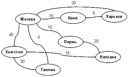 Смотрим на граф, на ребре между Москвой и Киевом число 15. Следовательно вес ребра 15. Размерности нет, так что вес "пятнадцать неизвестно чего"