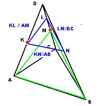 Дан тетраэдр DАВС. Точка М – середина ребра DC, точка К – середина АD. Постройте сечение тетраэдра плоскостью, содержащей точку К и параллельной плоскости