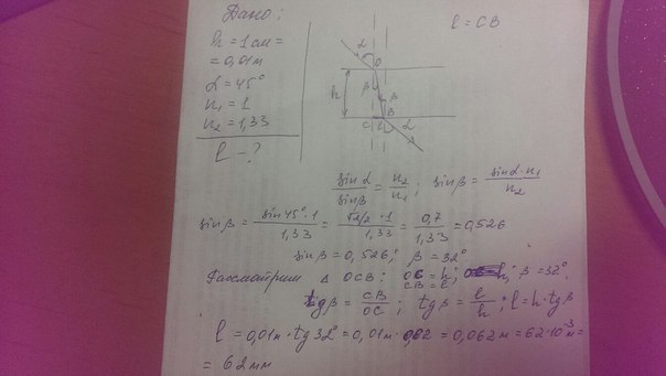 Луч света проходит через плоскопараллельную стеклянную пластинку толщиной 1 см.Найдите смещение луча при угле падения 45 градусов.