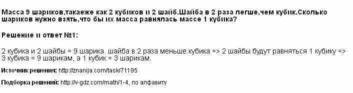 масса девяти шариков такая же как масса двух мячей и двух кубиков.кубик в 2 раза легче мяча.сколько шариков надо взять что бы их масса была равна массе одного мяча