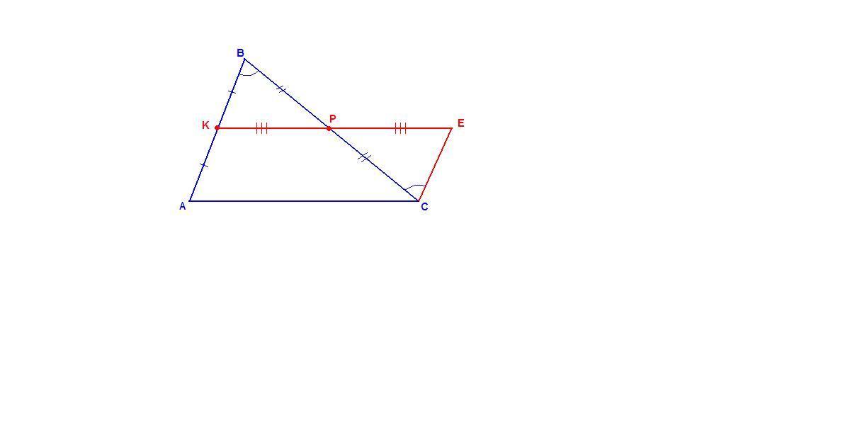 На прямой КР за точку Р отложим отрезок РЕ = КР.