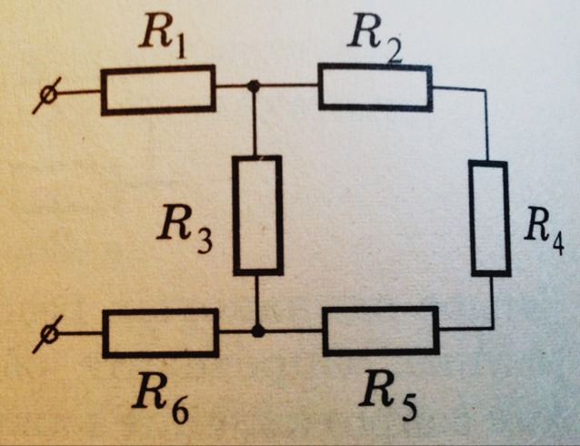 Найдите полное сопротивление R показанного на рисунке участка цепи, если R1=R2=R5=R6=3 Ом, R4= 24 Ом, R3= 20 Ом.