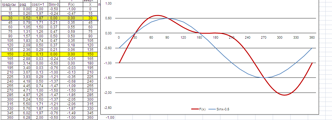 А решение проще простого. COS(X)+1=0 при 180 град и SIN(X)=0.5 при 30 и 150 град.