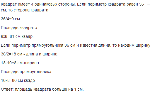 Квадрат и прямоугольник имеют одинаковый периметр 36 см. Площадь какого четырёхугольника больше, если длина прямоугольника 10 см?