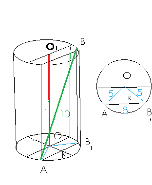 Концы отрезка АВ лежат на окружностях оснований цилиндра. Радиус основания равен 5 см, высота цилиндра равна 6 см, АВ=10 см. Определите расстояние между прямой АВ и осью цилиндра.