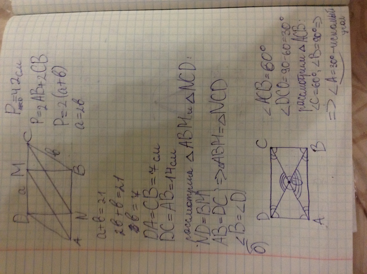 1)В параллелограмме АВСD одна сторона больше другой в два раза.Периметр паоаллелограмма равен 42 см.ВМ и DN-высоты араллелограмма.Найти стороны.Доказать,что треуг АВМ= треуг NCD
