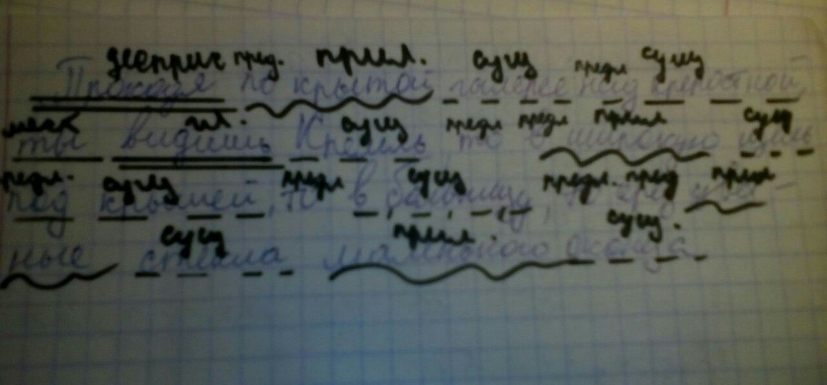 синтаксический разбор предложен:Проходя по крытой галерее над крепостной,ты видишь Кремль то в широкую щель под крышей то в больницу то через цвет ные стекла маленького оконца.