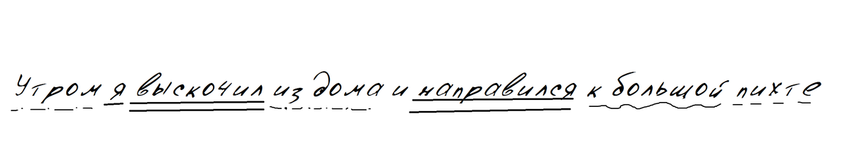 я - подлежащее, выраженное местоимением, выскочил и направился - сказуемые, выраженные глаголом, утром - обстоятельство, выраженное существительным , из дома - обстояткльство, выраженное существительным с предлогом , к большой пихте - дополнение, выраженное существительным и прилагательным с предлогом. ( повествовательное, невосклицательное, простое, распространенное, двусоставное, осложнено однородныии сказуемыми )