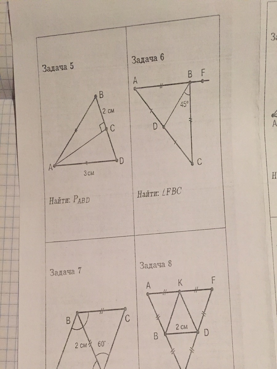 Задача 6.Дано :АВ =ВС,АС=DC,угол DBC = 45 градусов. Найти :угол FBC Рассмотрим треугольник АВD и треугольник СDВ. АВ=ВС, АD=DC, BD-общая сторона Из этого следует, что треугольники ABD =CDB (по 3 признаку равенства треугольников), отсюда следует, что соответствующие элементы равны, то есть угол АВD=углу DBC =45 градусов. Получается,что угол В= 90 градусов Угол FBC = 180 -(45+45)=90 градусов