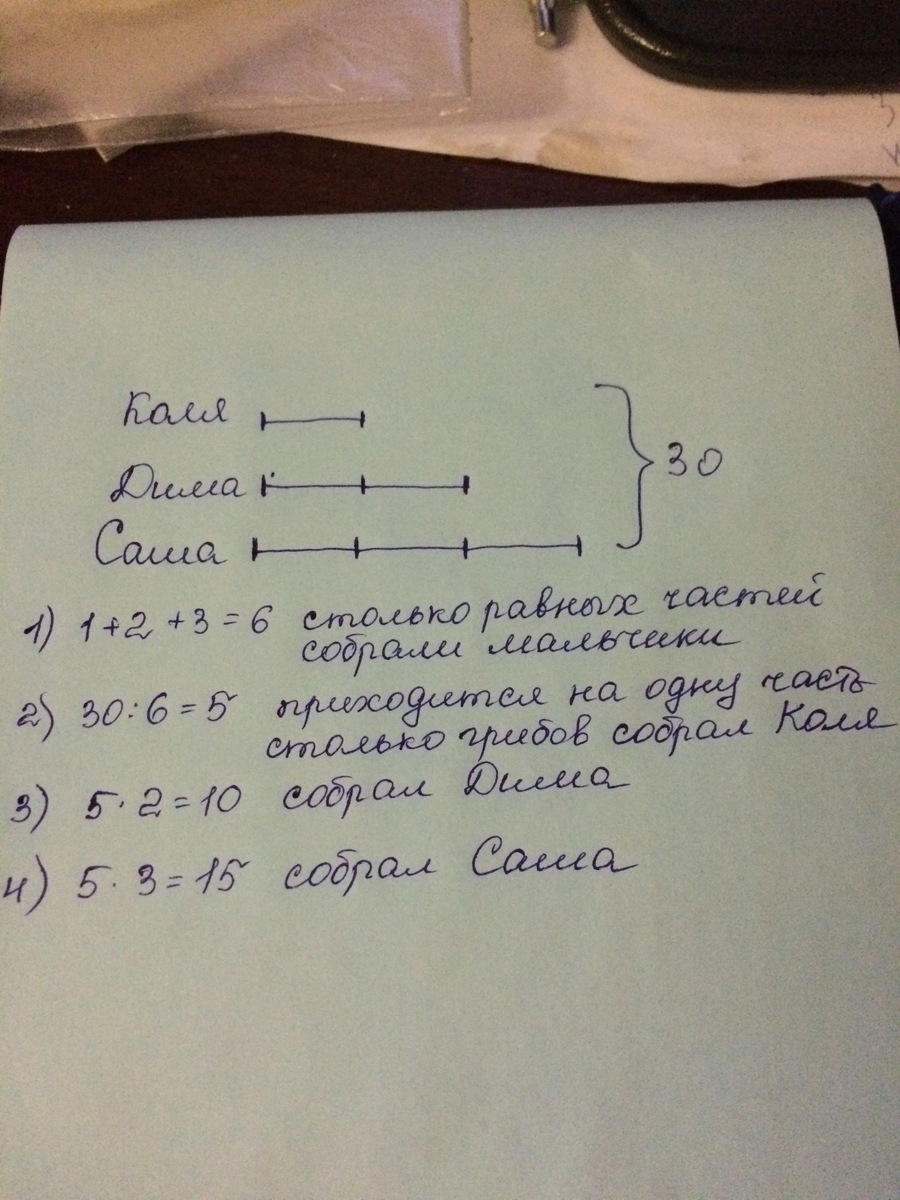 коля дима и саша нашли 30 грибов .дима нашёл в 2 раза больше грибов чем коля а коля в 3 раза меньше чем саша. сколько грибов нашёл каждый из них? чертёж к задачи и решение?