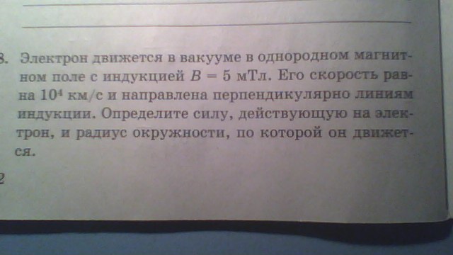Электрон движется в вакууме в однородном магнитном поле с индукцией В = 5 мТл. Его скорость равна 10^4 км/с и направлена перпендикулярно линиям индукции. Определите силу, действующую на электрон, и радиус окружности, по которой он движется.