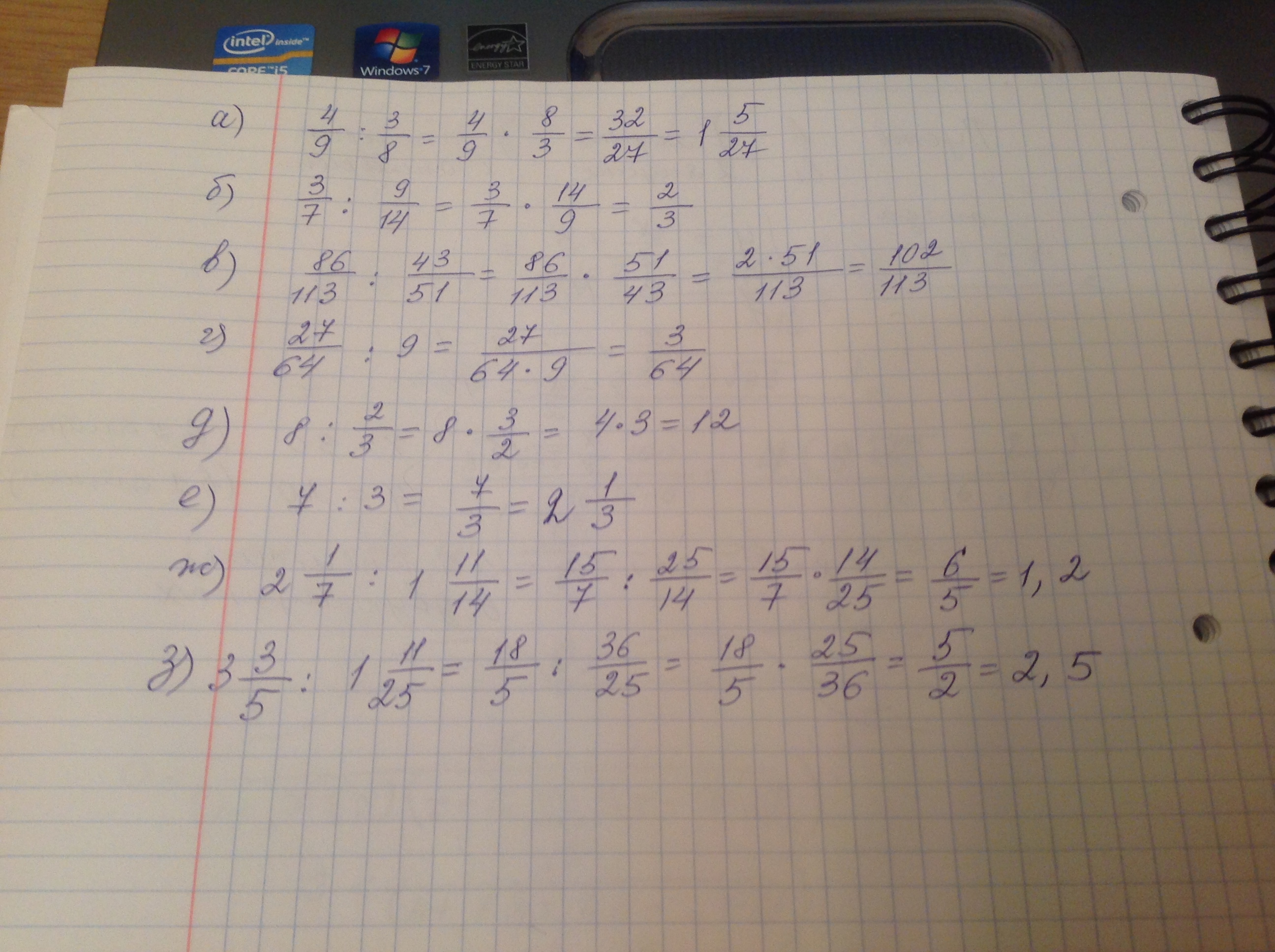 Выполните деление: а) 4/9 : 3/8; б) 3/7 : 9/14; в) 86/113 : 43/51; г) 27/64 : 9; д) 8 : 2/3; е) 7 : 3; ж) 2 1/7 : 1 11/14; з) 3 3/5 : 1 11/25.