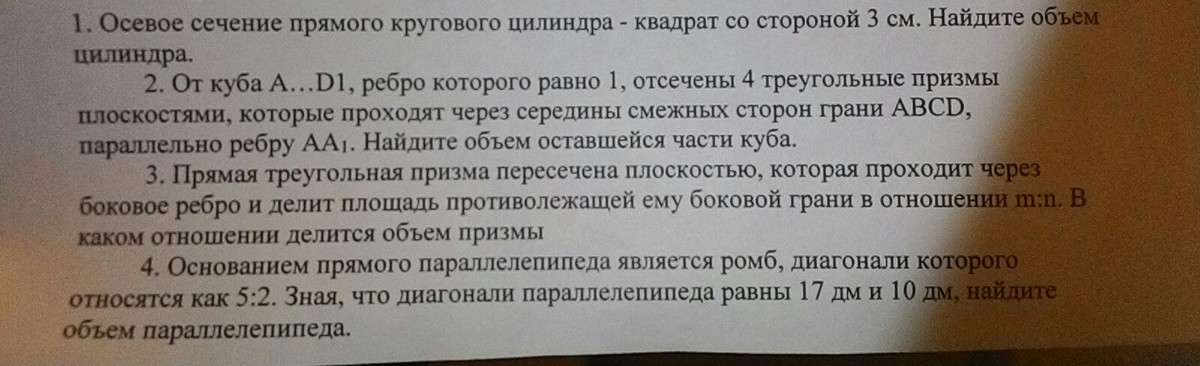 куб АВСДА1В1С1Д1, К на АВ, К1 на А1В1, Л на ВС, Л1 на В1С1, Т на СД, Т1 на С1Д1, Р на АД, Р1 на А1Д1, АК=КВ=А1К1=К1В1=ВЛ=ЛС=В1Л1=Л1С1=СТ=ТД=С1Т1=Т1Д1=ДР=АР=Д1Р1=А1Д1=1/2АВ=1/2=0,5, АВ=АД=ВС=СД=АА1, объем куба=АВ³=1*1*1=1, КР=КЛ=ЛТ=ТР, КЛРТ-квадрат, треугольник АКР прямоугольный, КР²=2АК², КР=0,5√2, объем оставшейся части призма КЛТРК1Л1Т1Р=площадь КЛТР*высотуРР1(АА1)=КР²*АА1=0,5√2*0,5√2*1=0,5 (половина куба)