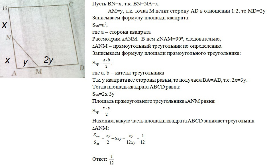 На сторонах AB и AD квадрата ABCD отмечены точки N и M. Точка N делит сторону AB пополам, а точка M делит сторону AD в отношении 1 : 2, считая от вершины A. Определите, какую часть площади квадрата ABCD составляет площадь треугольника ANM.
