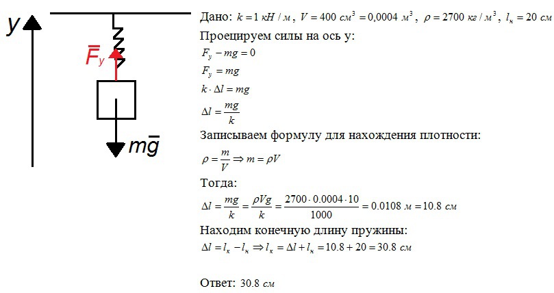 Якою стане довжина пружини жорсткістю 1 кН/м, якщо до неї підвісити алюмінієвий тягарець об'ємом 400 см кубічних? Початкова довжина пружини 20 см.
