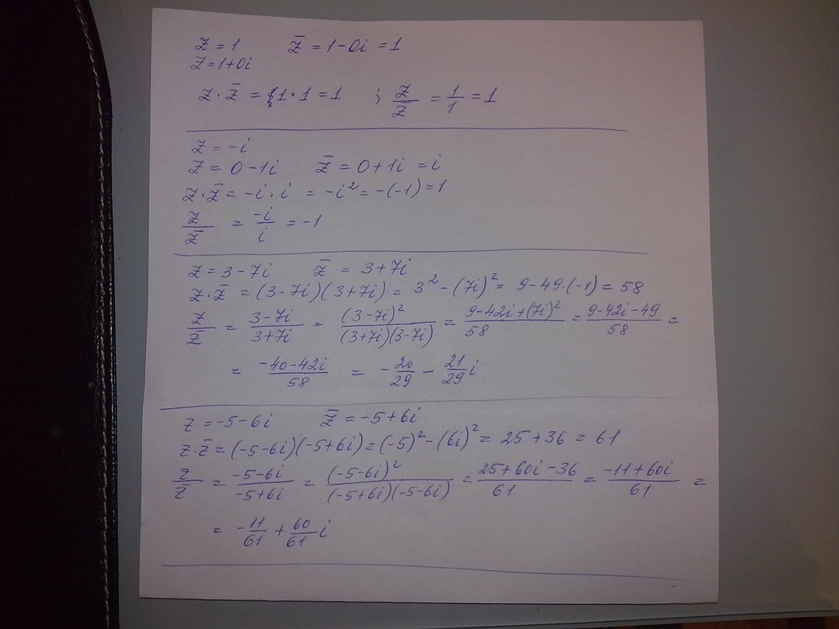 Для комплексного числа z найдите сопряженное число и вычислите произведение и частное