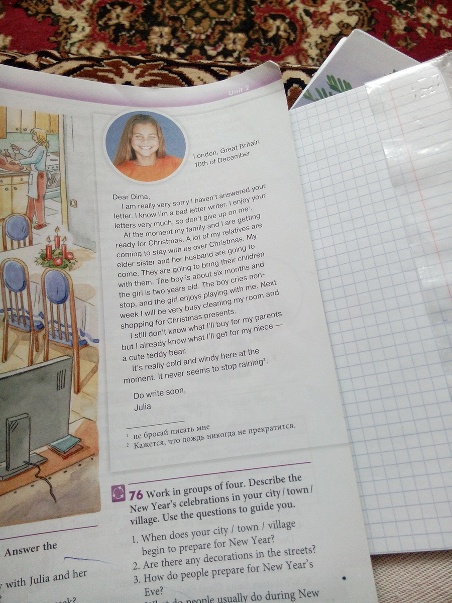Великобритания Великий 10-й NBAR Де Уважаемые Дима, ответил на ваш ваш утра действительно очень письмо писателя, уплотнительное Приступая письмо, знаю плохие дают до письма очень много, так что не в момент моя семья и родственники готовы на Рождество А My My подходит к более чем собирается эр сестра и ее муж и прийти. Они собираются, чтобы принести о нераспространении с ними. Мальчик ahout шесть MOT меня. Следующая девушка два года. купить с и остановить, и девушка любит играть в моей комнате неделе будет очень занят чистящие родители подарки. покупки Tor I'W купить для моего до сих пор не знаю, что, но знаю, что получу за моей племянницы уже UA мило медведя Это действительно холодно и ветрено здесь на данный момент. Это никогда не кажется, чтобы остановить дождь ли написать в ближайшее время, Юлия Он 6pocan nuncaTb Клещ 76 Работа в группах по четыре человека. Опишите в Вашем городе / городе / вопросов новогодних, чтобы направлять вас. деревня. Используйте деревню 1. Когда ваш начать rep3 на улицах?