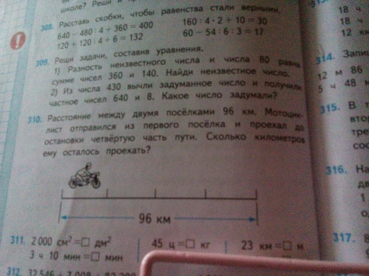 96/4=24 км осталось проехать мотоциклисту