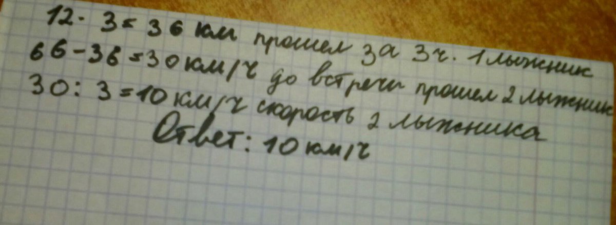 Два лыжника вышли одновременно навстречу друг другу из двух разных пунктов,расстояние между которыми 66 км. Скорость первого 12 км /ч. Скакой скоростью ехал второй лыжник, если они встретились через 3 часа?