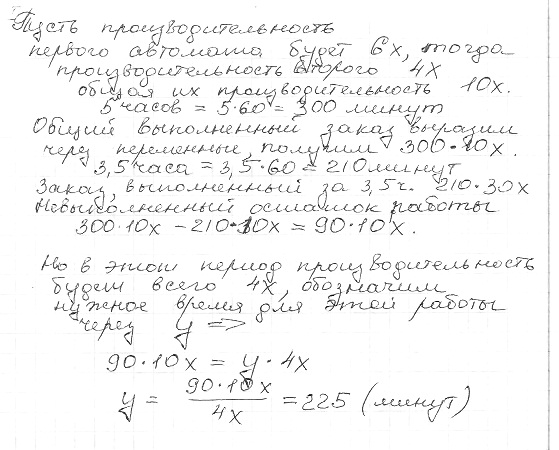 За 3,5 часа они выполнят (3x+2x)*3,5 = 17,5x или 17,5x/25x = 0,7 всей работы. 2-ому автомату останется доделать 1 - 0,7 = 0,3 всей работы. У него уйдёт на это 0,3 : 2/25 = 3,75 часа,то есть 225 минут.