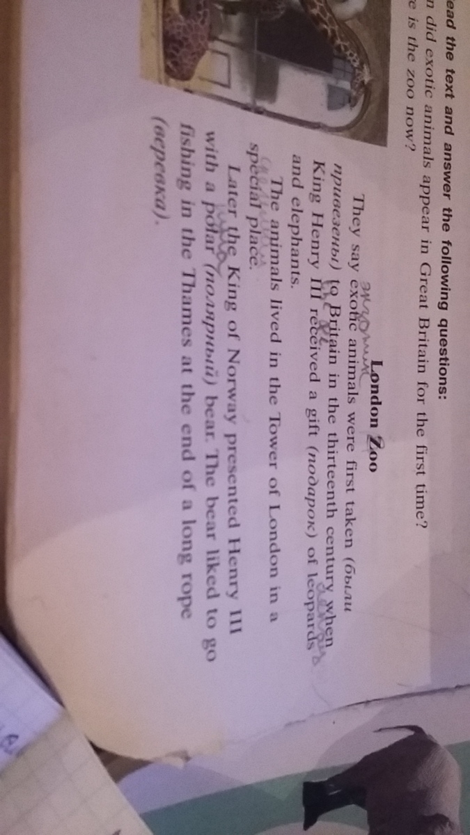 The first animals were gift to Henry III the king of Britain in 13th century They were leopards and elephants. Those animals lived in The Tower of London. Than the Norway king presented a polar bear to Henry III. This bear could go fishing in the Thames.