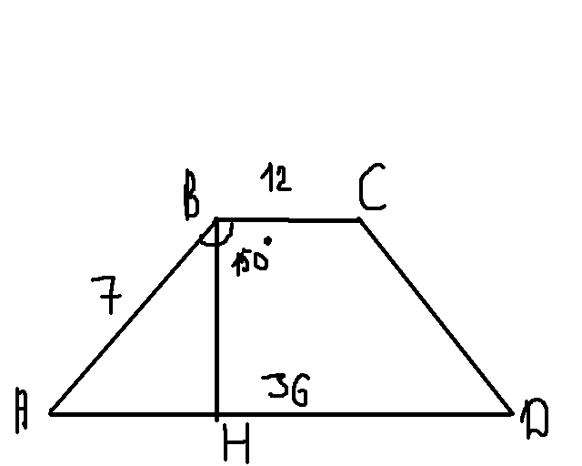 Основания трапеции 36 и 12 см. Боковая сторона 7 см, и образует с одним основанием угол 150 градусов. Найти S трапеции.