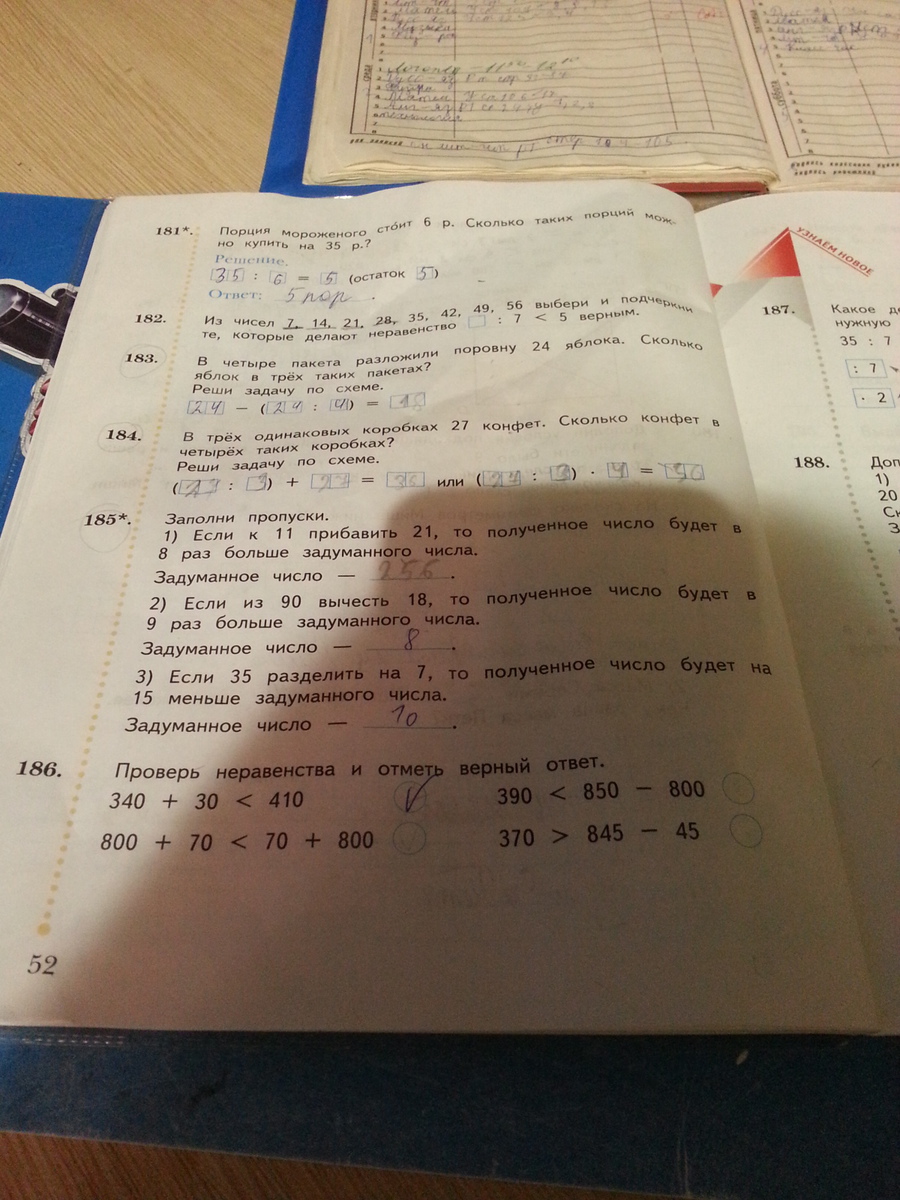 183 и 184 у тебя правильно, 185: (11+21):8=4 ; (90-18):9=8; (35:7)+15=20