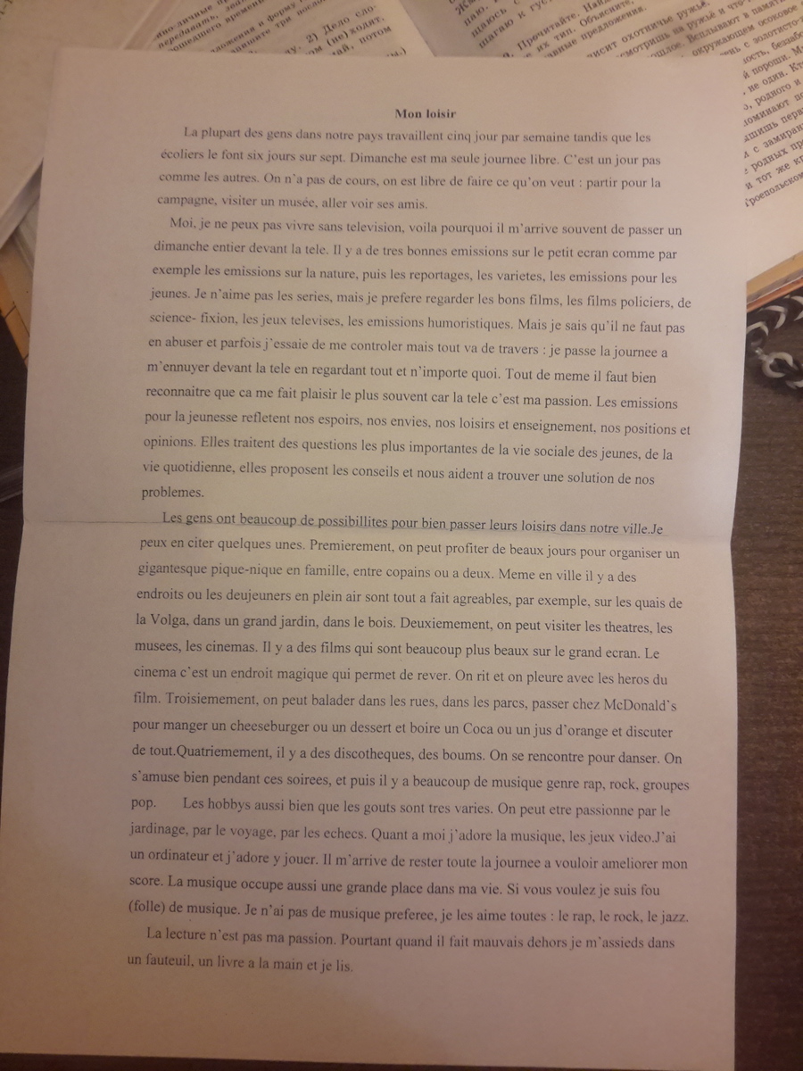3) Люди имеют много возможностей для хорошего проведения их досуга в нашем городе. Я могу назвать некоторые. Во-первых, можно воспользоваться хорошим днем для организации огромного завтрака на траве в семье, среди друзей или вдвоем. И в городе есть места или завтраки на свежем воздухе являются очень приятными, например, на набережной Волги, в большом саду, в лесу. Во-вторых, можно посетить театры, музеи, кино. Есть фильмы, которые намного более привлекательны на большом экране. Кино – это магическое место, которое позволяет мечтать. Мы смеемся и плачем с героями фильма. В-третьих, можно прогуляться по улицам, в парках, зайти в Макдональдс, чтобы скушать чизбургер или десерт и выпить кока-колы или апельсиновый сок, и обсудить все. В-четвертых, есть дискотеки, бумы(?). Мы знакомимся, чтобы потанцевать. Мы веселимся в течение вечера и потом там есть много музыки в жанре рэп, рок, поп-групп. Хобби также хороши, поскольку вкусы очень разнообразные. Можно быть охваченным страстью садоводства, путешествия, шахмат. Что касается меня, я люблю музыку, видеоигры. У меня есть компьютер и мне нравится на нем играть. Случается оставаться весь день в желании улучшить мою скорость. Музыка также занимает большое место в моей жизни. Если хотите, я помешанный на музыке. У меня нет любимой музыки, я это все люблю: рэп, рок, джаз. Чтение – не мой предмет страсти. Однако, когда плохая погода на улице, я сажусь в кресло, книга в руках и я читаю.