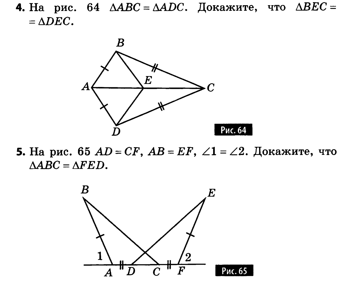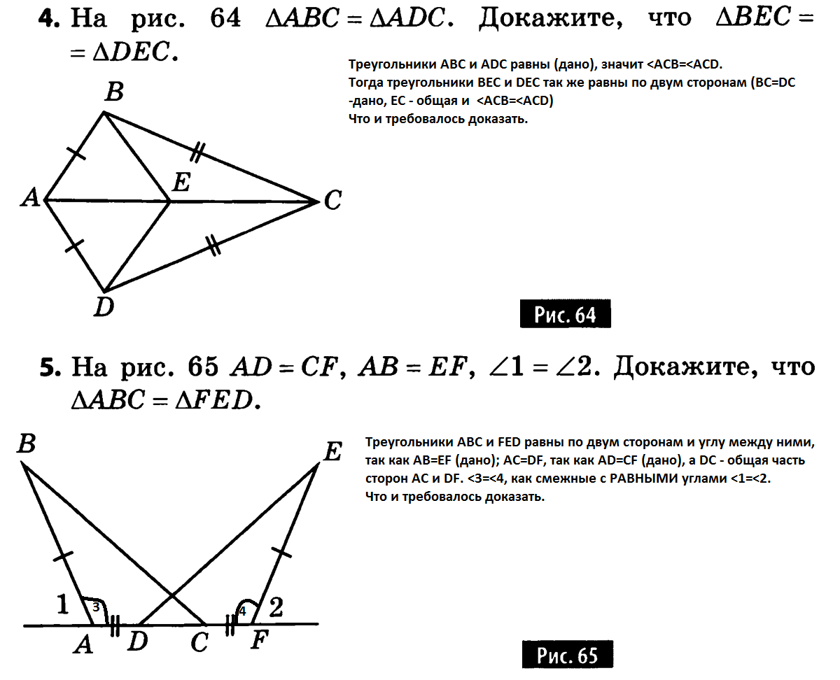 5. Треугольники АВС и FED равны по двум сторонам и углу между ними, так как АВ=EF (дано); АС=DF, так как AD=CF (дано), а DC - общая часть сторон АС и DF. <3=<4, как смежные с РАВНЫМИ углами <1=<2.