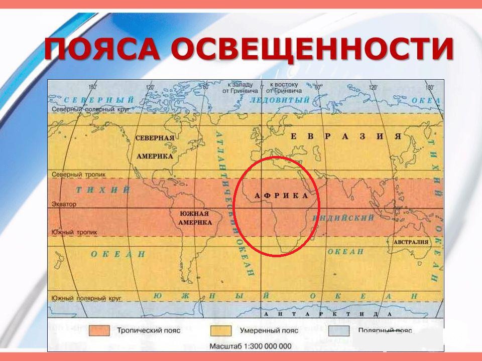 Большинство территории Африки лежит в тропическом поясе освещенности. Смотрите рисунок в прикрепленном вложении снизу.