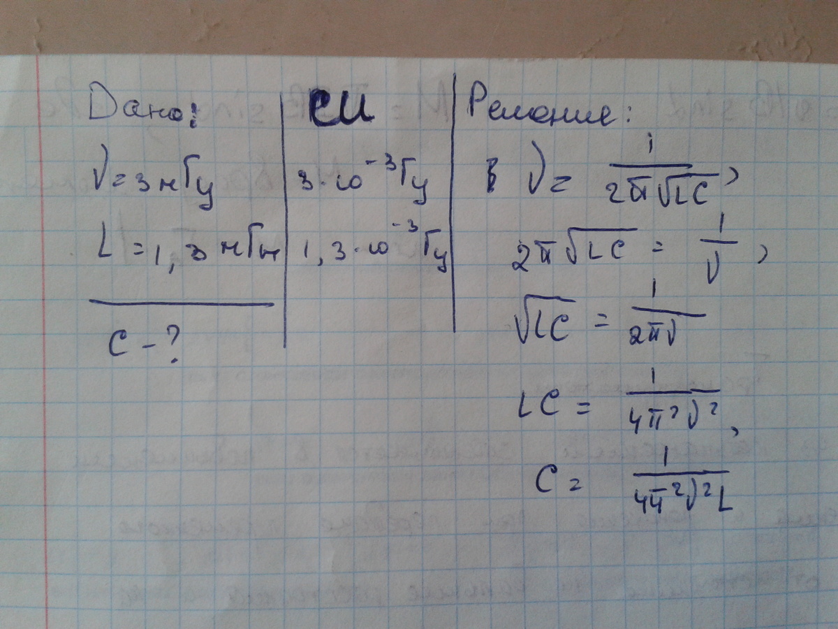 необходимо собрать колебательный контур частотой 3мГц используя катушку индуктивностью 1.3 мГн .Какова должна быть ёмкость конденсатора