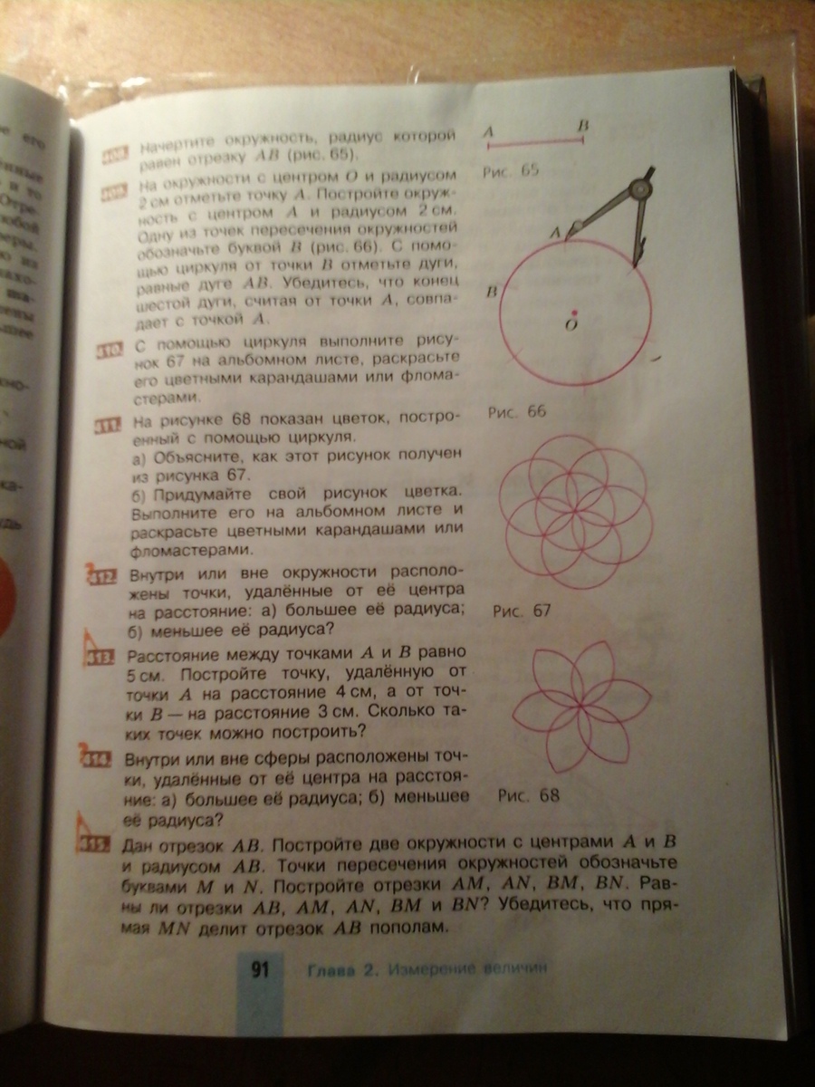 На рисунке 68 показан цветок., построенный с помощью циркуля .