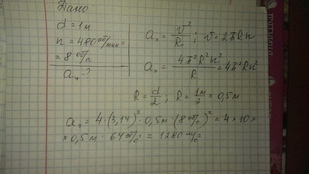 Ротор турбины диаметром 1 м делает 480 об/мин. Каково центростремительное ускорение концов лопаток турбины? Если можно с решением