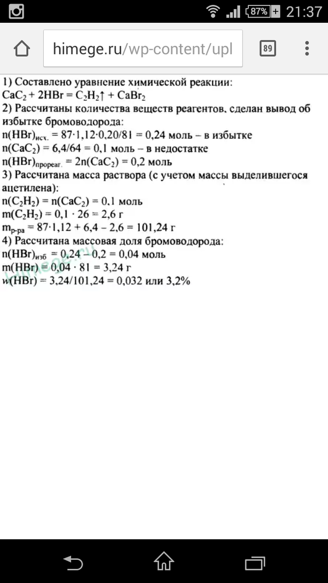 Карбид кальция массой 6,4 г растворили в 87 мл бромоводородной кислоты (= 1,12 г/мл) с массовой долей 20%. Какова массовая доля бромоводорода в образовавшемся растворе?