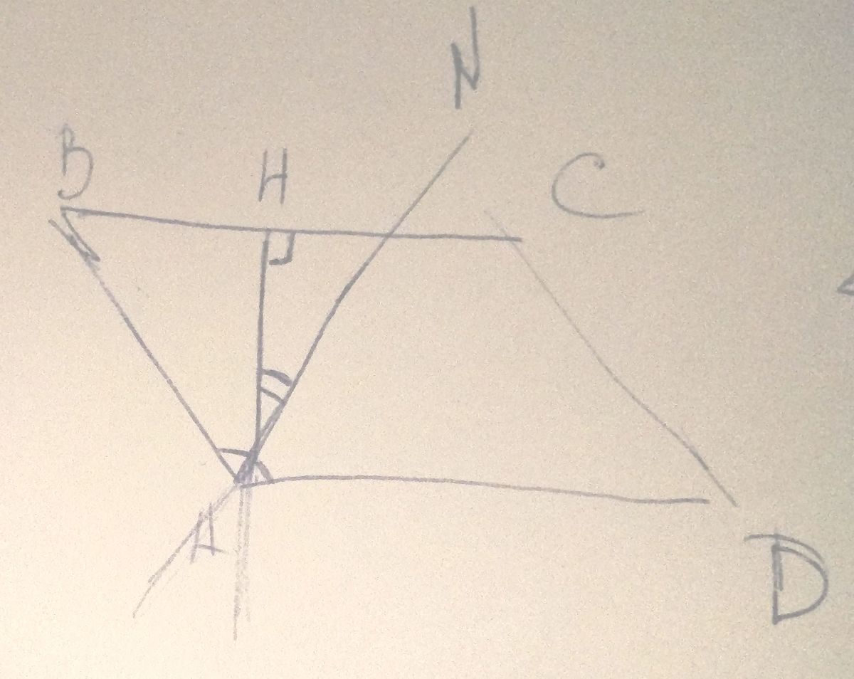 ∠NAD=∠HNA,т.к AN секущая при параллельно прямых AD и BC. Рассмотрим ΔHNA. Он прямоугольный. ∠HNA=180°-90°-17°=73°, т.е. ∠NAD=73°. Т.к.AN-биссектриса угла BAD, то ∠NAD=∠NAB=73°. В ΔABN ∠ABN=180°-∠BAC-∠BNA=180°-2·73°=34°. Т.к. ∠ABN=∠ABC, то ∠ABC=34°. Ответ: ∠ABC=34°.